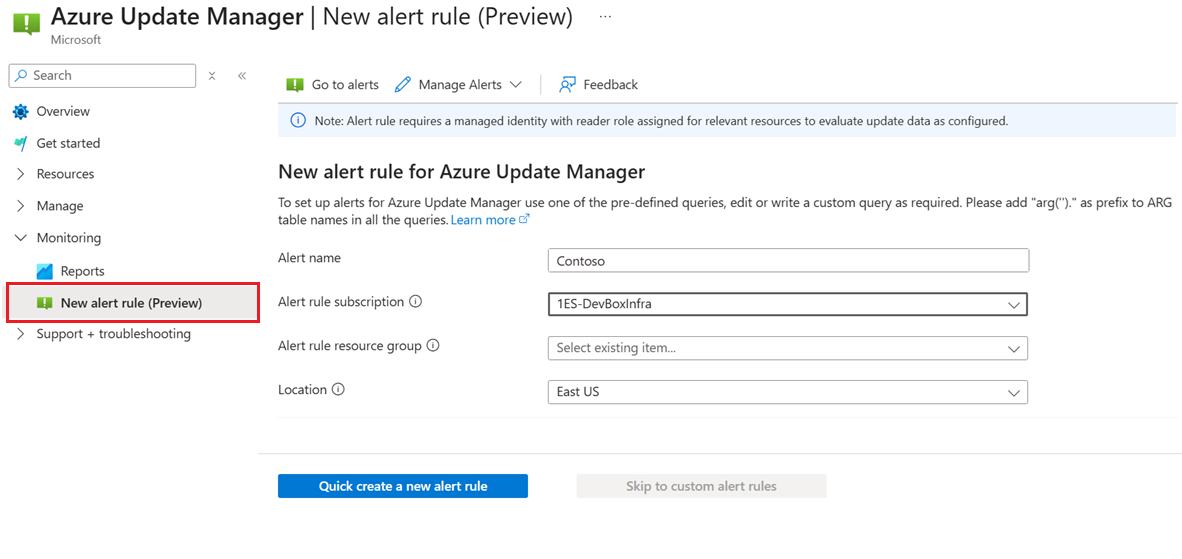 2. Under Monitoring, select New alerts rule (Preview) to create a new alert rule.