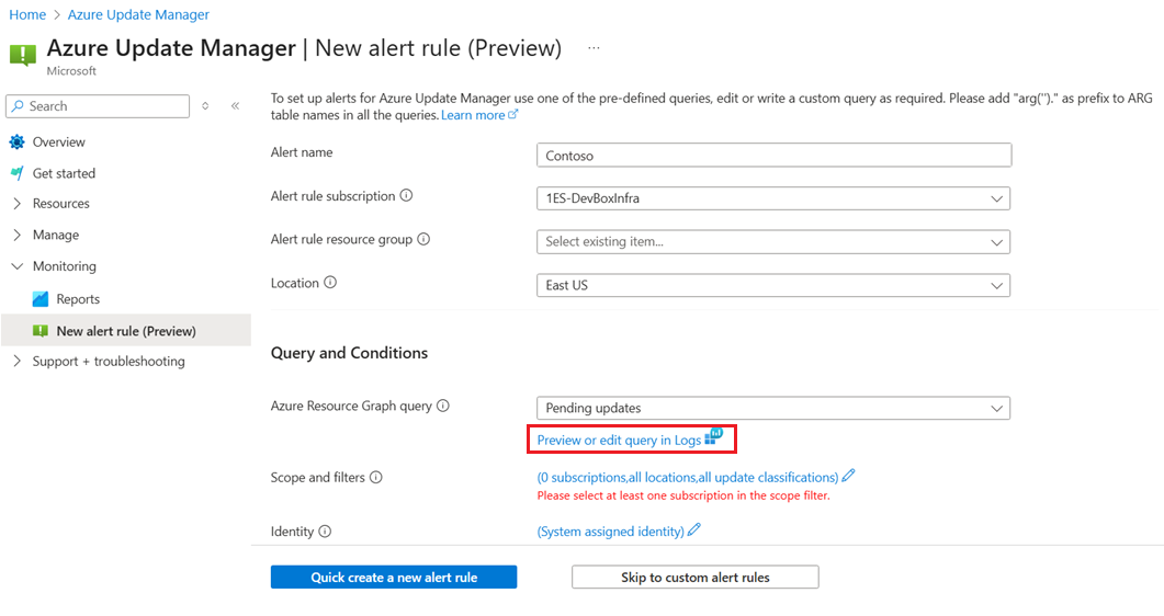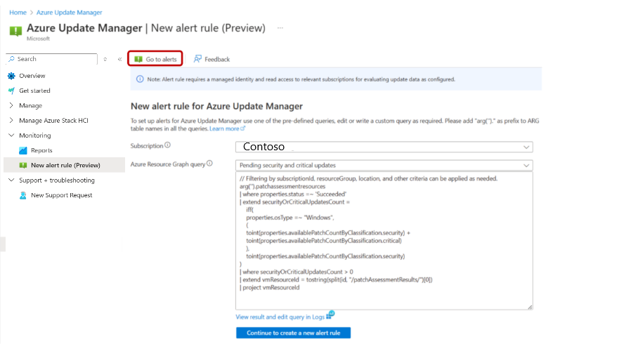 To enable alerts (Preview) with Azure Update Manager through Azure portal, follow these steps: