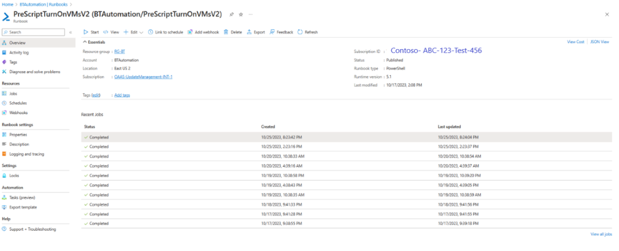 - Select the specific runbook name that is associated to the pre or post event. In the overview page, you can view the recent jobs of the runbook along with the execution and status details.