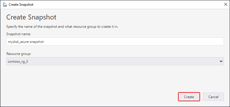 In Create Snapshot, specify the name of the snapshot and the resource group in which you'll create it. Select Create.