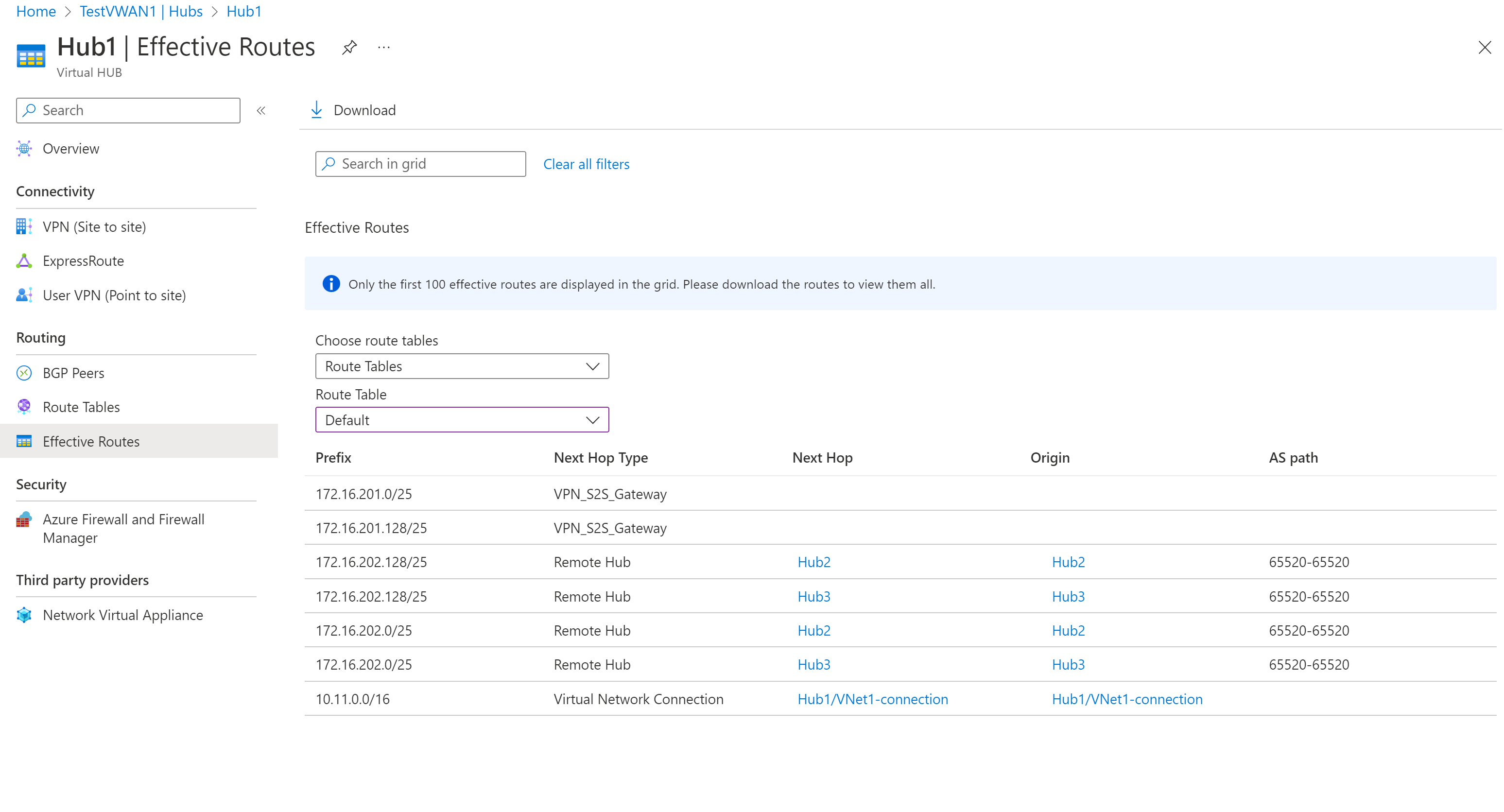 In the Azure portal, go to your Virtual HUB -> Effective Routes page.
