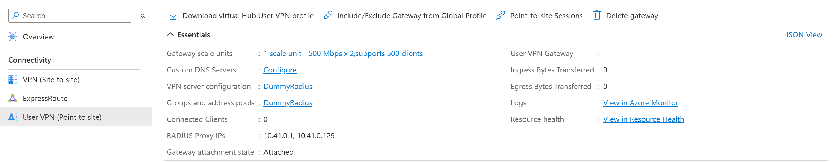After you create the User VPN gateway, go to gateway and note the RADIUS proxy IPs field. The RADIUS proxy IPs are the source IPs of the RADIUS packets the User VPN gateway sends to your RADIUS server. Therefore, your RADIUS server needs to be configured to accept authentication requests from the RADIUS proxy IPs. If the RADIUS proxy IPs field is blank or none, configure the RADIUS server to accept authentication requests from the hub's address space.