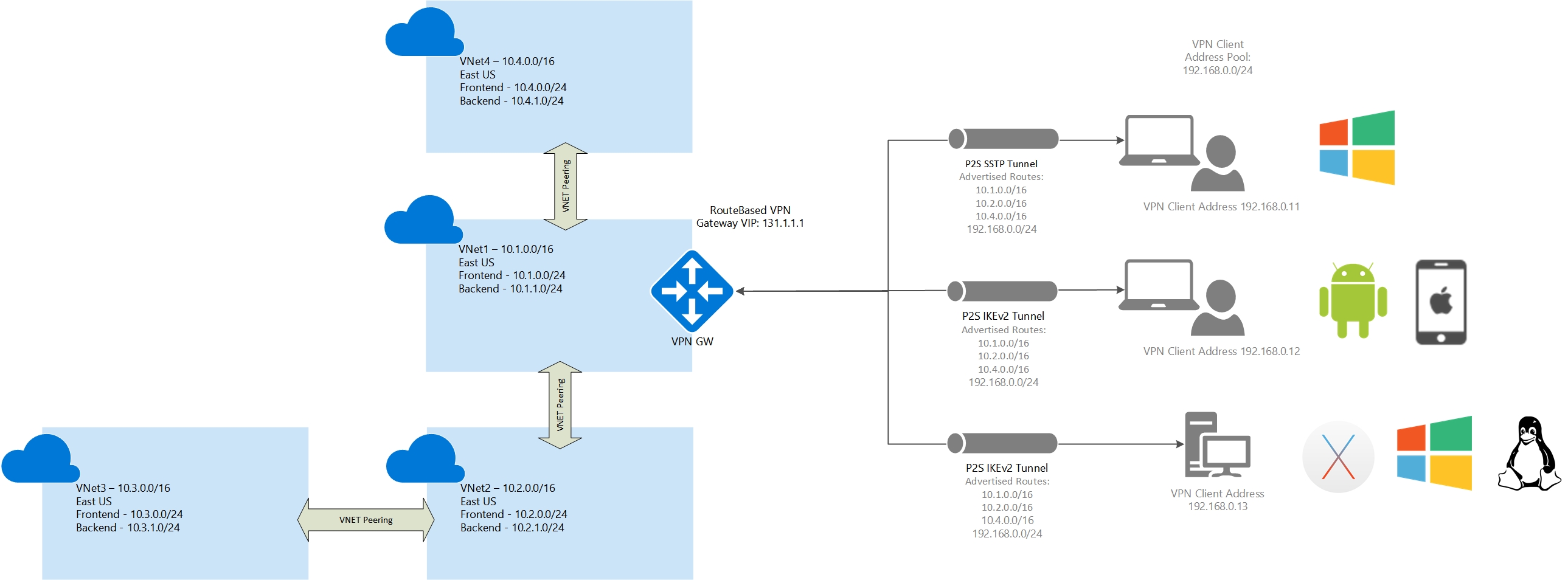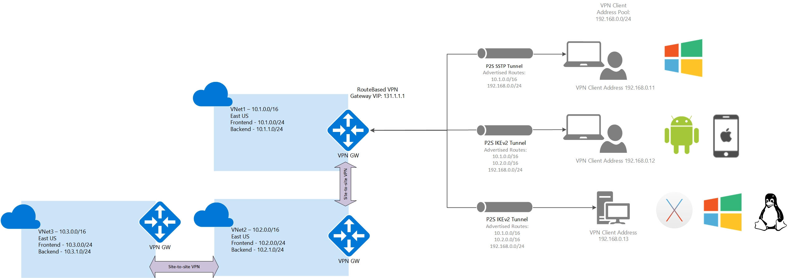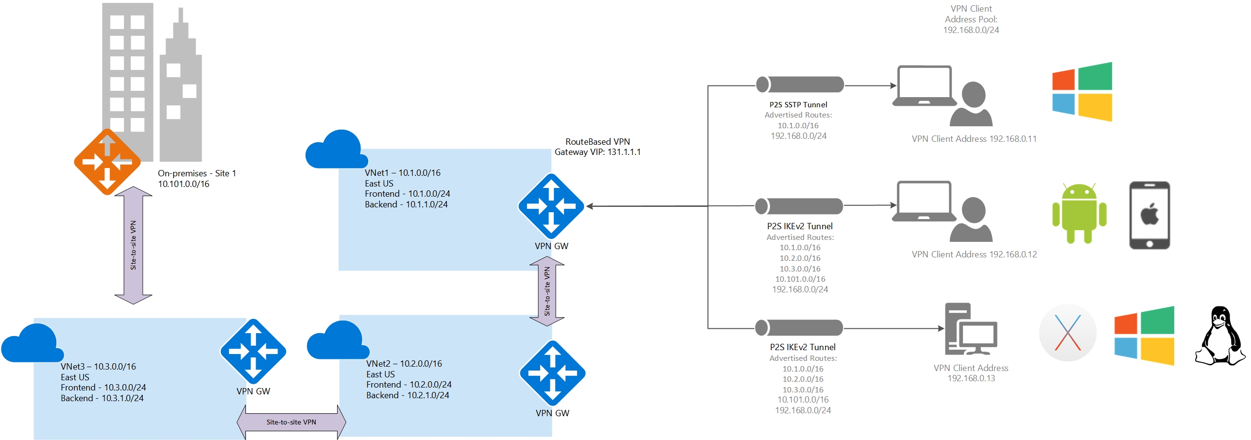 Routes added to Windows clients: 10.1.0.0/16, 192.168.0.0/24