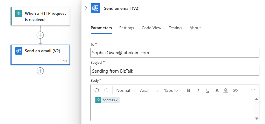 The send port sends the .txt file to the logic app workflow by using the URI that you provided. After your workflow receives the files, the workflow sends an email with the sample message to the specified To address.