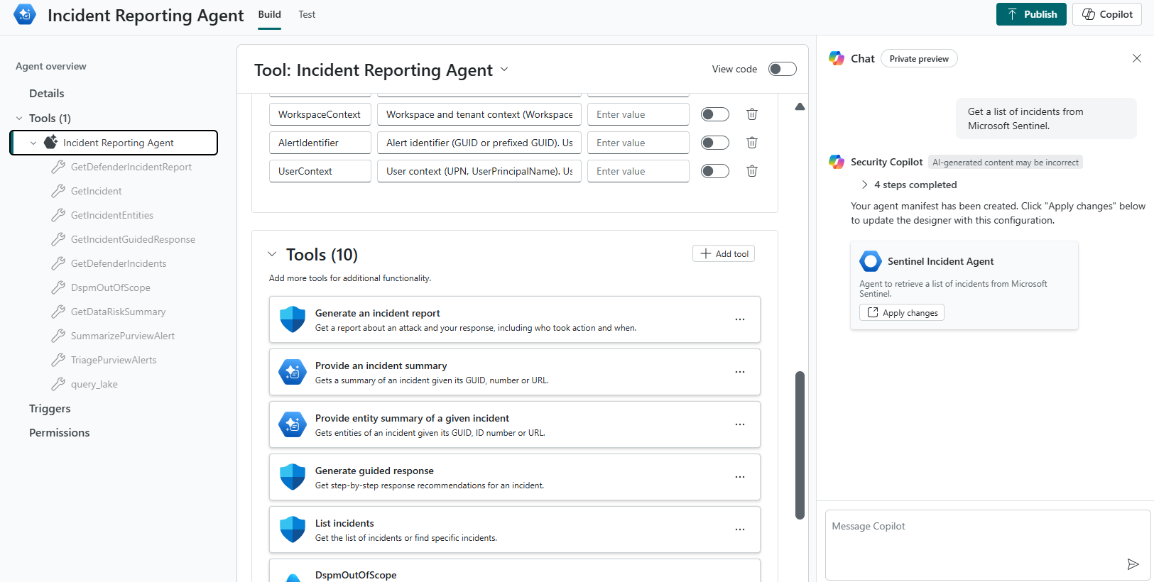 You can create a Security Copilot tool or an agent in any order. The development process allows flexibility to fit your workflow.