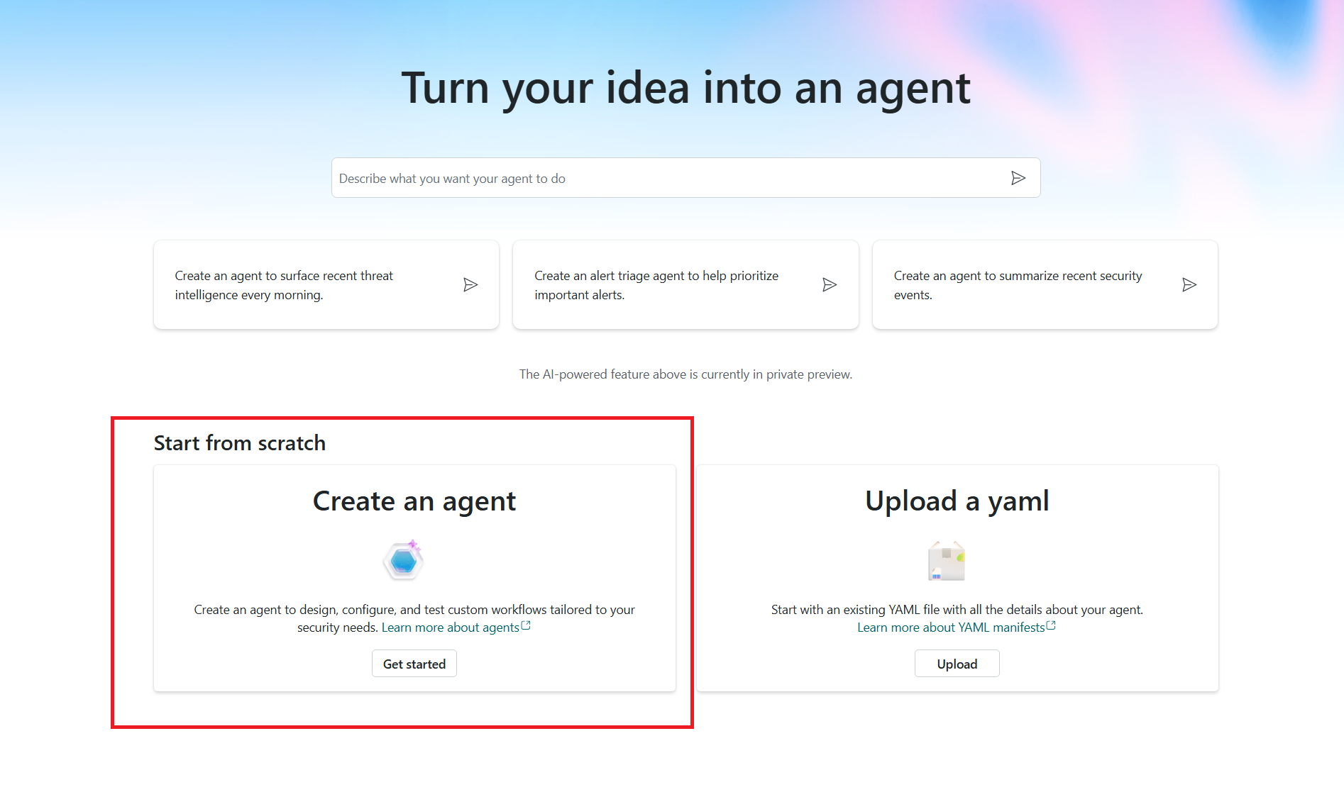 You can create custom agents quickly and intuitively with the new form-based experience. This article explains how to start building your custom agent from scratch using the agent builder in Security Copilot.