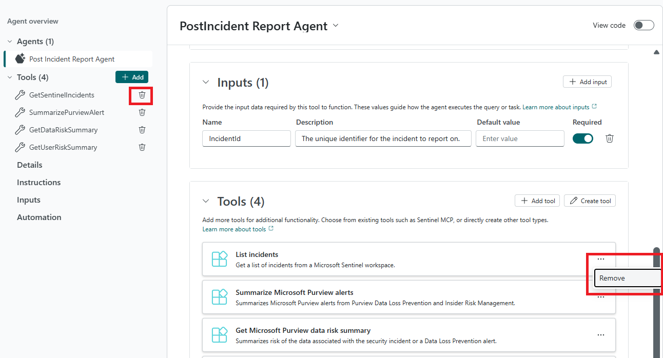 - Provide input parameters required for the agent tool. You must guide the AI model in your description, if only some values are possible (for example, "SeverityLevel should be one of