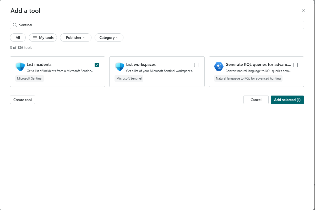 Add an existing tool from the extensive Security Copilot tools catalog or create a new tool that enables your agent to perform specific tasks and interact with external systems.