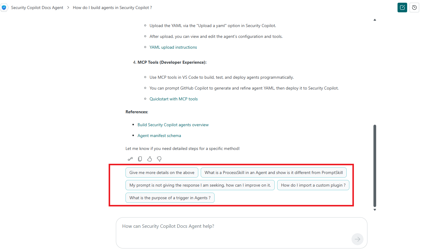 Users can explore the agent’s capabilities, get contextual next steps, and resolve issues directly in Security Copilot.