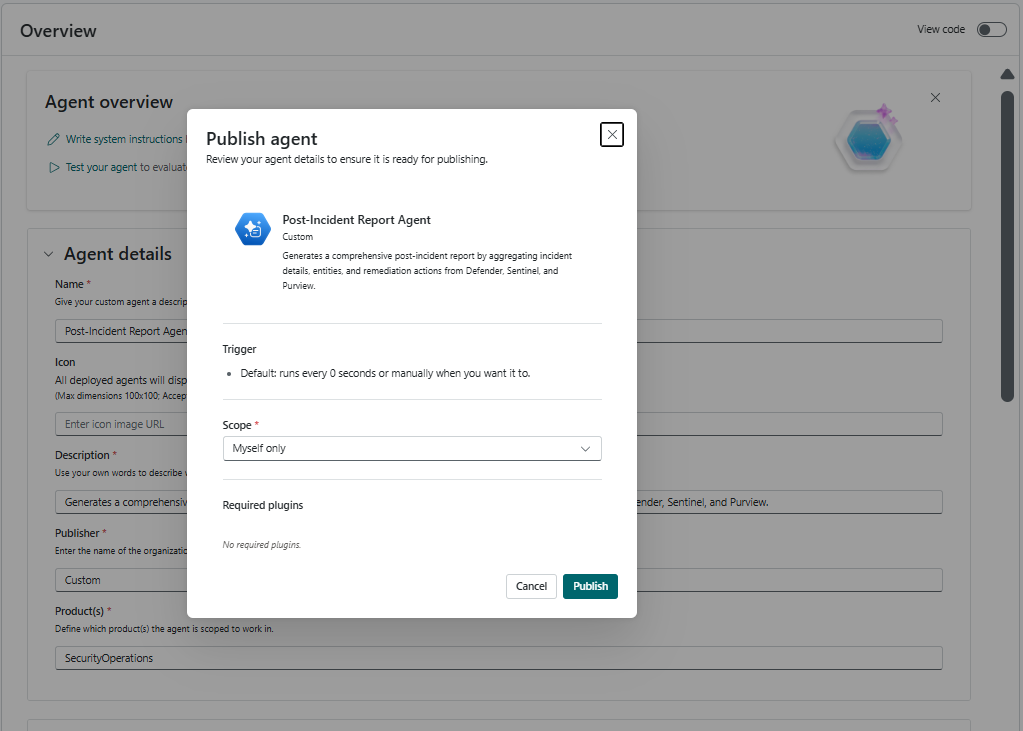 After a successful build of the Security Copilot agent artifacts into a manifest file, you can choose to publish your agent to your own Security Copilot tenant.