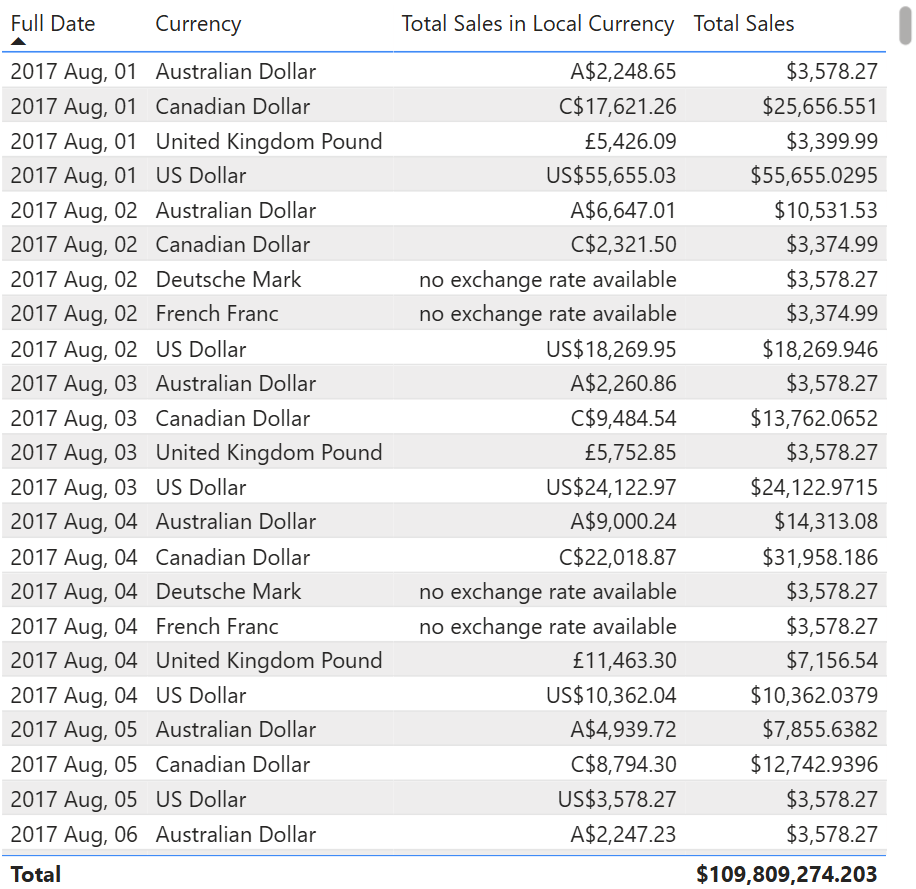 This logic can then be used to define a measure such as Total Sales in Local Currency.