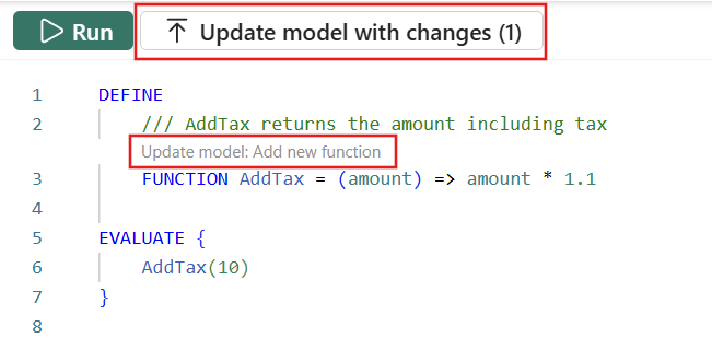 You can define, update, and evaluate user-defined functions in DAX query view. For additional information on DAX query view, see DAX query view.