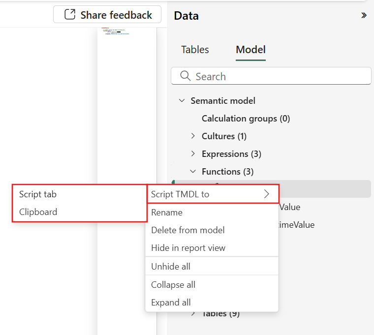 - TMDL view. UDFs can also be authored and edited in TMDL. TMDL view also includes context-menu Script TMDL to.
