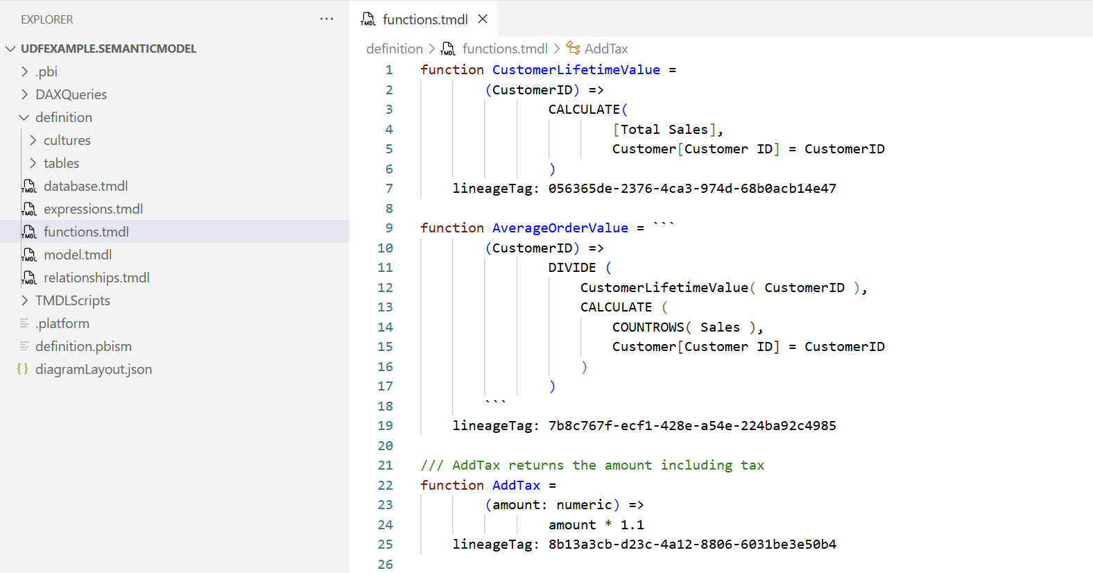 You can define and/or update user-defined functions in TMDL view. For additional information on TMDL view, see TMDL view.