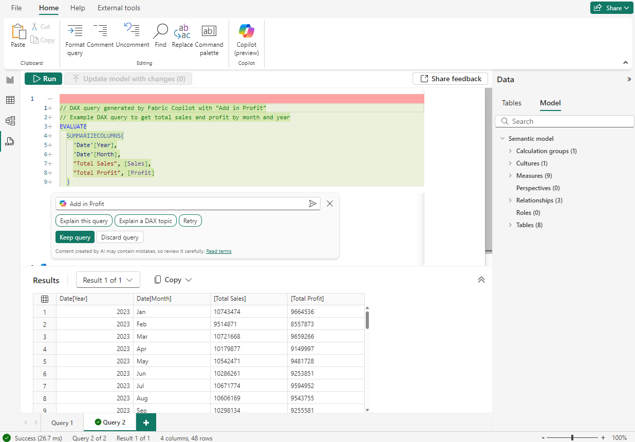 To use Copilot to create a DAX query, type in a prompt to describe what DAX query you would like generated and select Send or press Enter. Alternatively, you can click the Write DAX query inspire button. To run what is returned, select Run or press F5 to see the results of the DAX query. To keep the query and exit Copilot, select Keep query to add it to query tab.