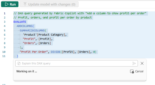 Copilot can provide a detailed explanation of a DAX query. Again, select the entire DAX query and invoke Copilot. This time select the Explain this query button.
