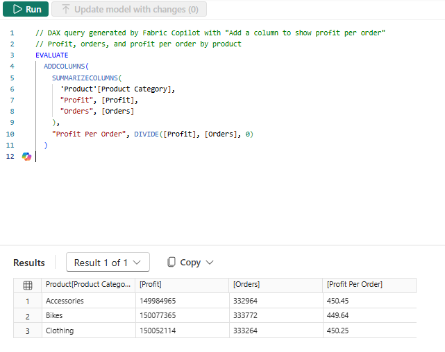 After the initial DAX query is generated, you can simply adjust by typing in additional user prompts.
