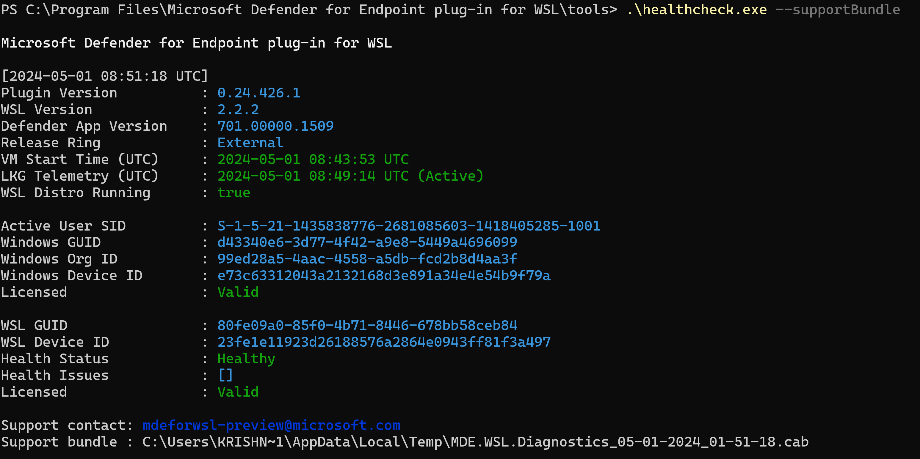 cd "%ProgramFiles%\Microsoft Defender for Endpoint plug-in for WSL\tools".\healthcheck.exe --supportBundleThe support bundle can be found in the path provided by the previous command.
