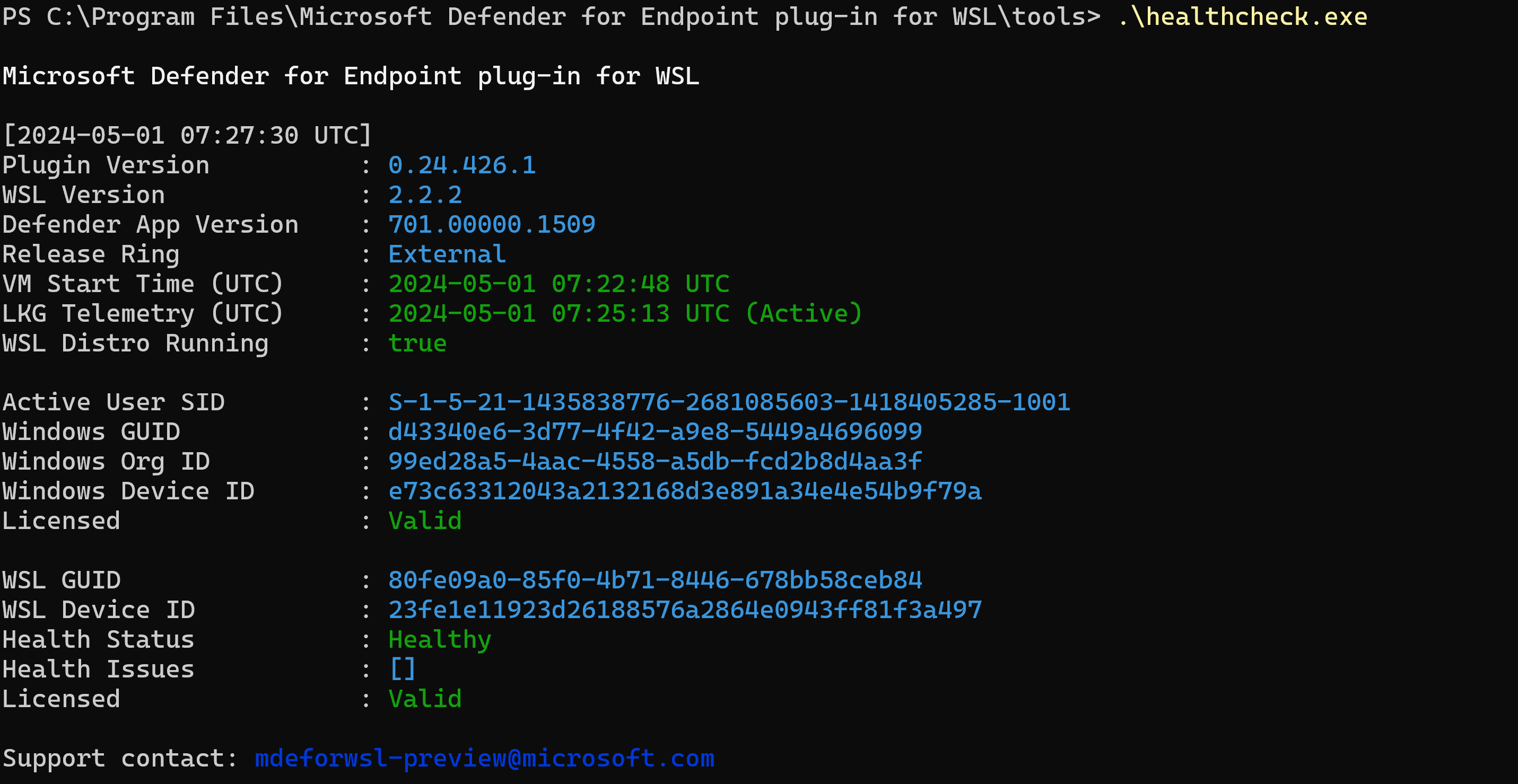 DefenderforEndpointPlug-in.dll. This DLL is the library to load Defender for Endpoint to work within WSL. You can find it at%ProgramFiles%\Microsoft Defender for Endpoint plug-in for WSL\plug-in.healthcheck.exe. This program checks the health status of Defender for Endpoint and enables you to see the installed versions of WSL, plug-in, and Defender for Endpoint. You can find it at%ProgramFiles%\Microsoft Defender for Endpoint plug-in for WSL\tools.
