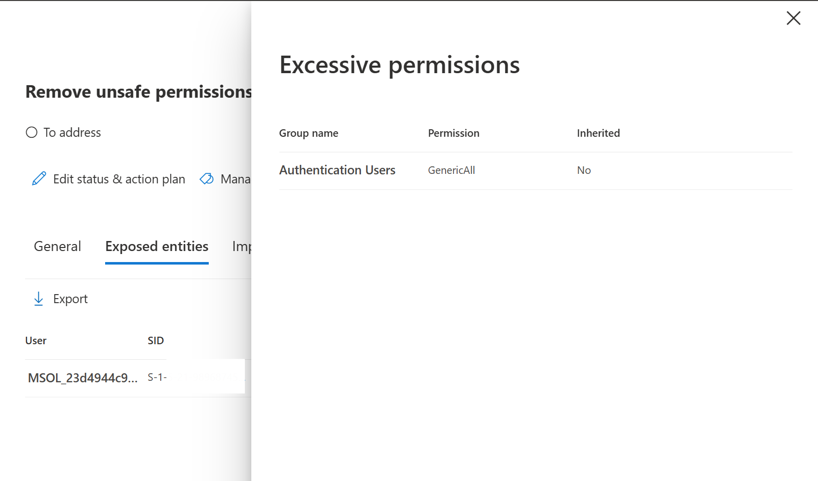 Review the list of exposed entities to identify accounts with unsafe permissions. For example: