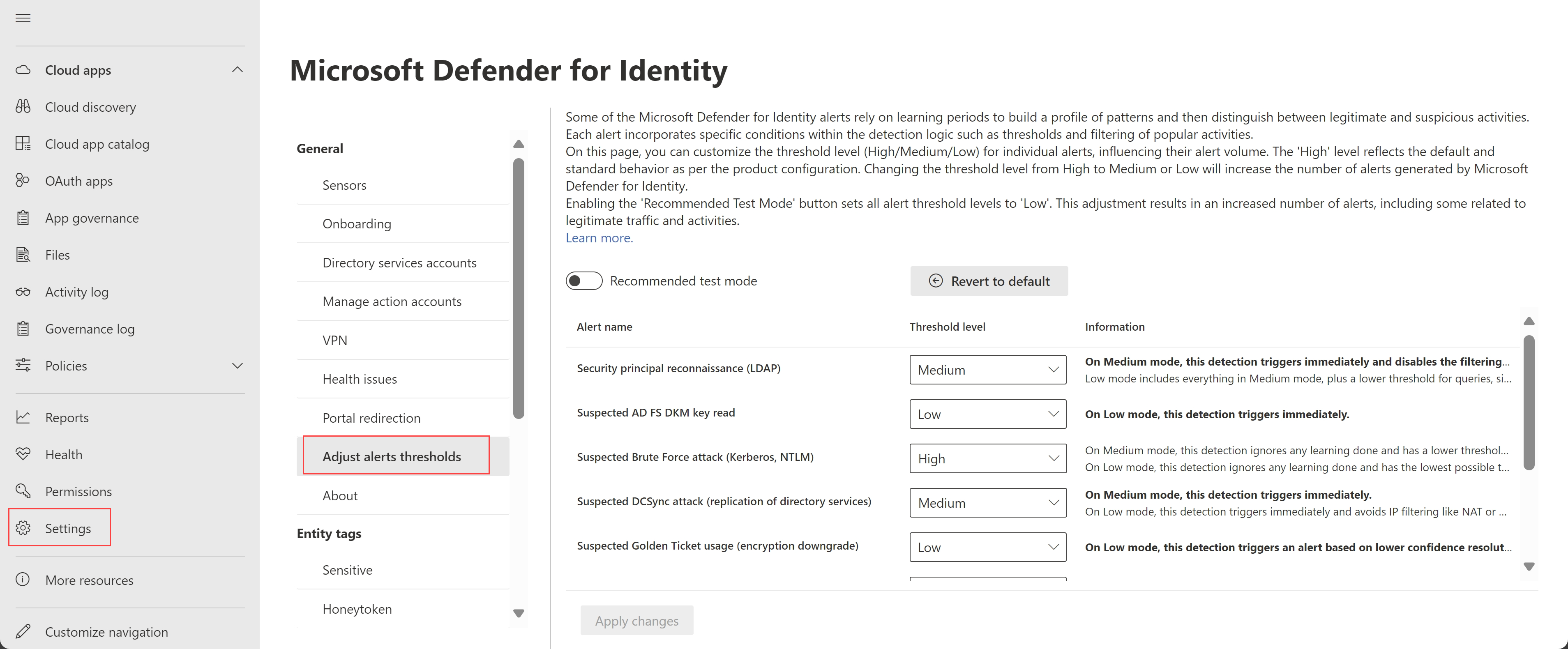 The Advanced Settings page originally listed the Account enumeration reconnaissance alert under the Remove learning period options as configurable for sensitivity settings. This alert was removed from the list and replaced with the Security principal reconnaissance (LDAP) alert. This user interface bug was fixed in November 2023.