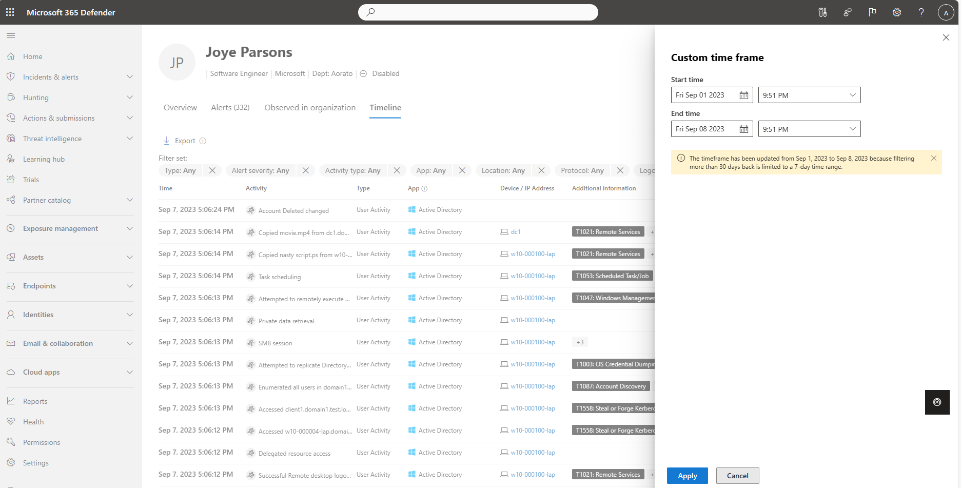 To view activities and alerts on the identity timeline within a specific time frame, select the default 30 Days and then select Custom range. Filtered data from more than 30 days ago is shown for a maximum of seven days at a time.