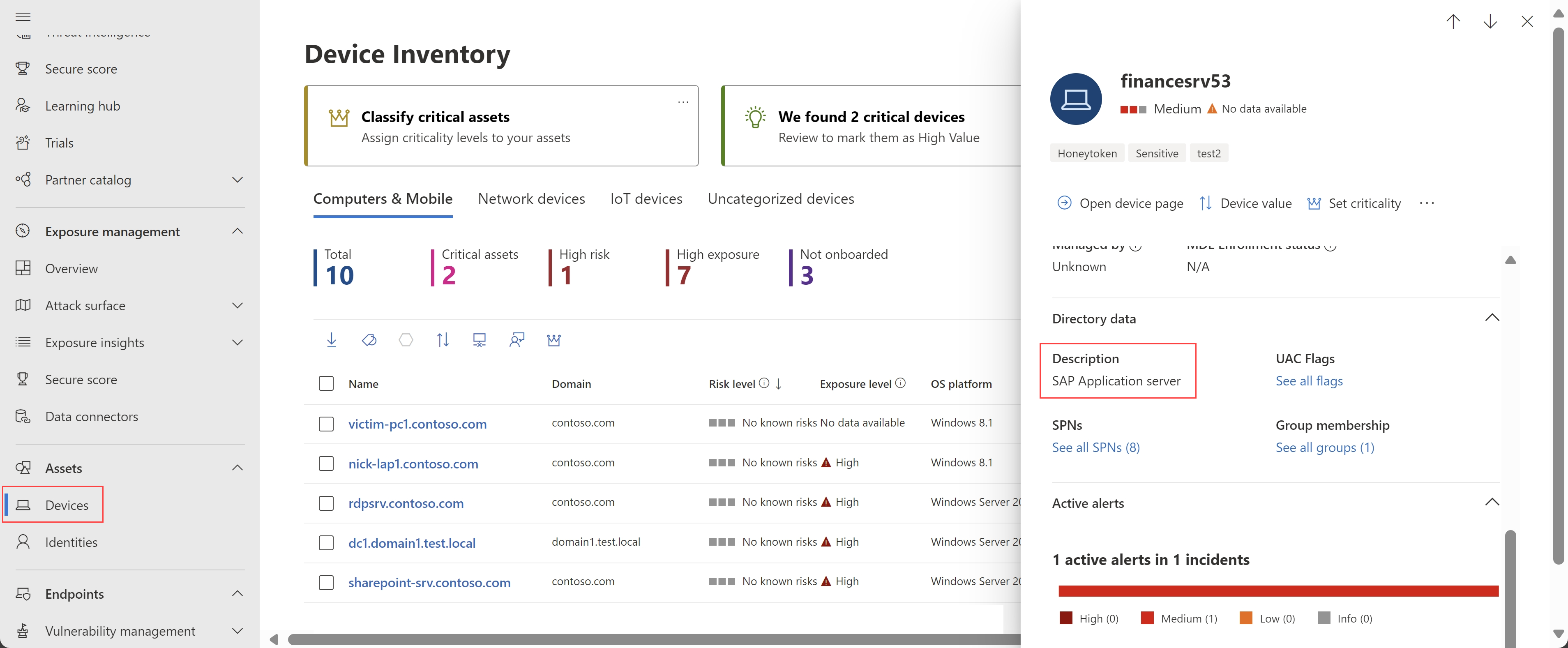 Microsoft Entra ID risk level is now available on the Identity Inventory assets page, the identity details page, and in the IdentityInfo table in Advanced Hunting, and includes the Microsoft Entra ID risk score. SOC analysts can use this data to correlate risky users with sensitive or highly privileged users, create custom detections based on current or historical user risk, and improve investigation context.