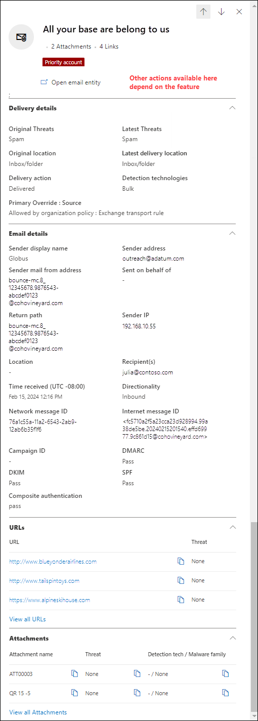 The Email summary panel is the email details flyout that's available in many features in the default email protections for cloud mailboxes and in Defender for Office 365. The Email summary panel contains standardized summary information about the email message taken from the full details that are available on the Email entity page in Defender for Office 365.