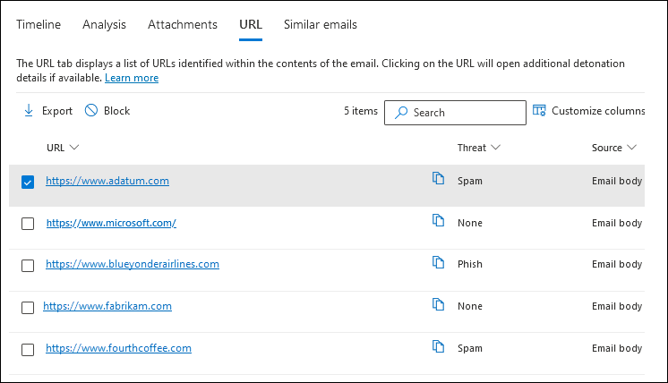 The URL view shows information about all original or rewritten URLs in the message, along with the scanning results for each URL.