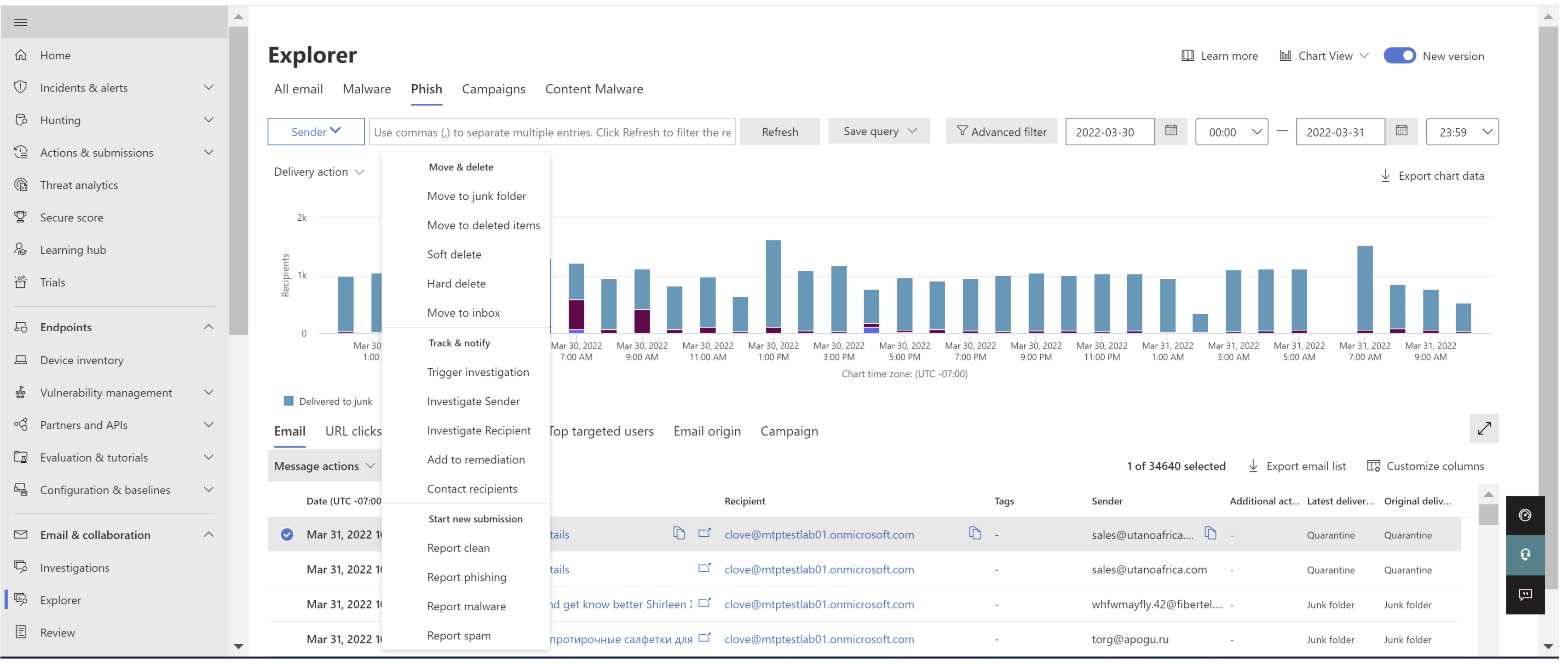 Admins can take remediation actions like moving email messages to Junk, Inbox, or Deleted items folder and delete actions like soft deleted or hard delete from Advanced Hunting pages.