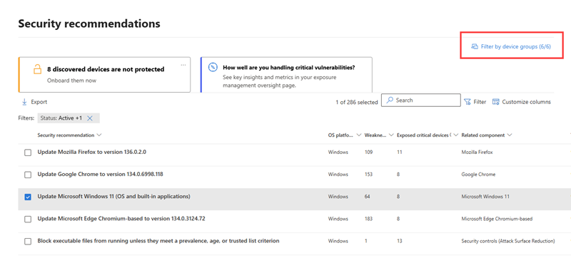 By default, the page shows all recommendations filtered to all device groups. To view recommendations for a specific device group: