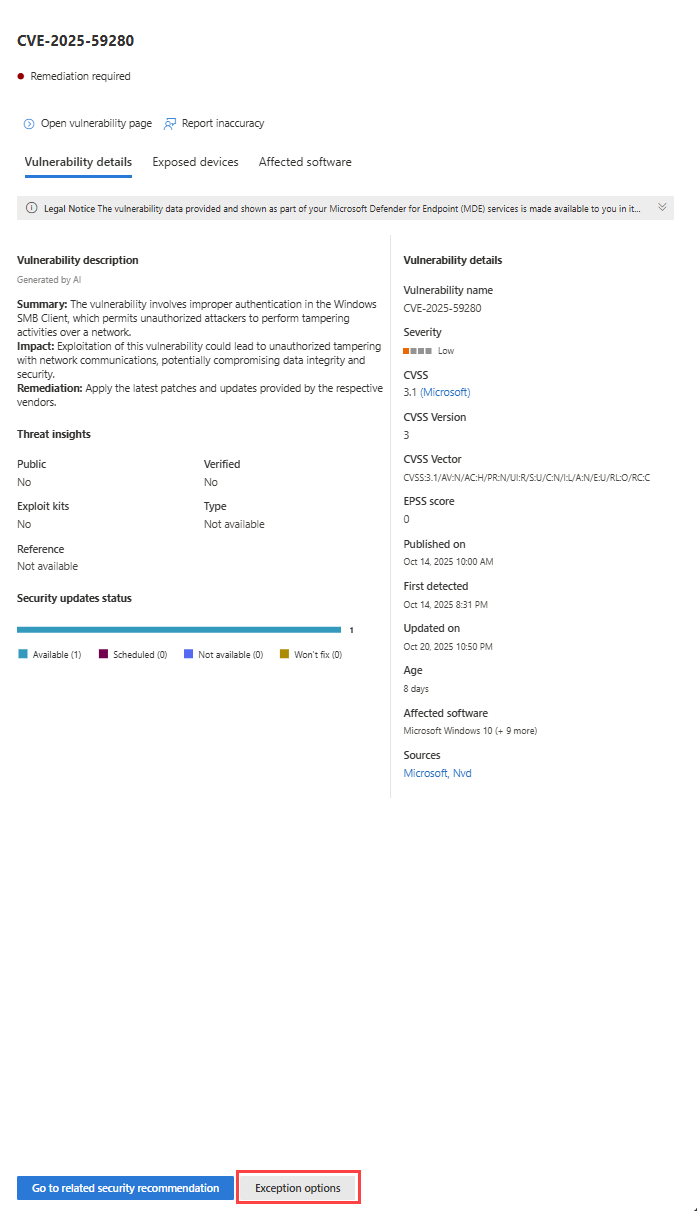 Security recommendation exceptions: Exclude specific security recommendations from analysis in your environment. You create this exception at the security recommendation level, which applies to all underlying CVEs associated with that recommendation.