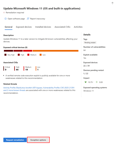 Microsoft Defender Vulnerability Management provides exceptions to help you control what type of data is relevant to your organization and to selectively exclude specific data from your remediation efforts.