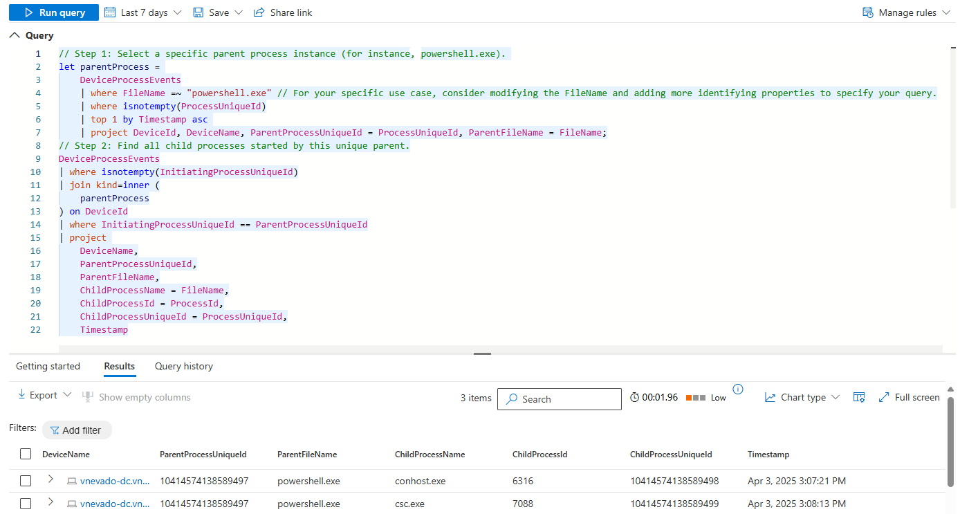 This query demonstrates how to use the ProcessUniqueId and InitiatingProcessUniqueId fields to link a specific parent process to its child processes. By matching each child’s InitiatingProcessUniqueId to the parent’s ProcessUniqueId, it isolates only those child processes launched by that exact parent instance, even if process IDs get reused over time.
