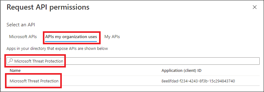 On your application page, select API Permissions > Add permission > APIs my organization uses >, type Microsoft Threat Protection, and select Microsoft Threat Protection. Your app can now access Microsoft Defender XDR.