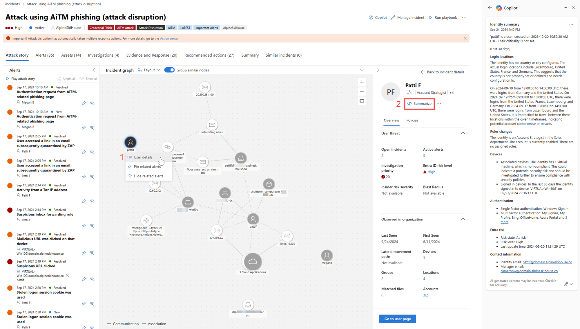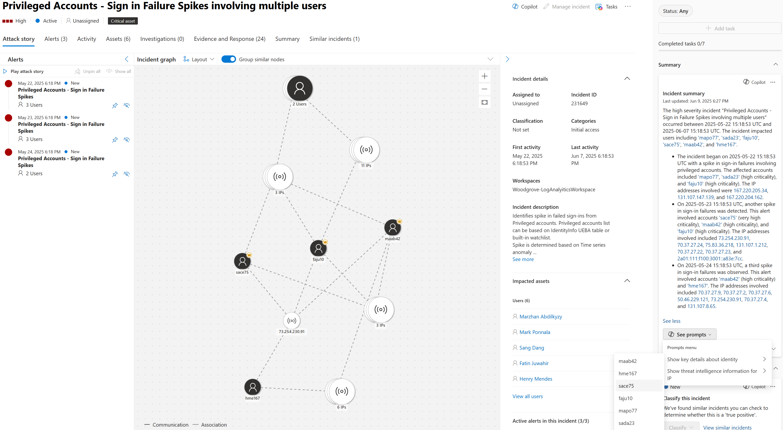 Investigating incidents with multiple alerts can be a daunting task. To immediately understand an incident, you can tap Copilot to summarize an incident for you. Copilot creates an overview of the attack. The overview contains essential information for you to understand what transpired in the attack, what assets are involved, and the timeline of the attack. Copilot automatically creates a summary when you navigate to an incident's page. It also helps you understand the assets involved and how to act by suggesting prompts about related identities, devices, IPs, and so on.