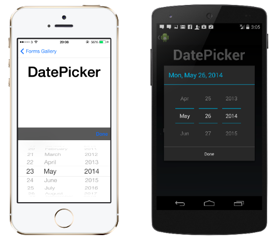 The visual representation of a DatePicker is very similar to the one of Entry, except that a special control for picking a date appears in place of a keyboard.