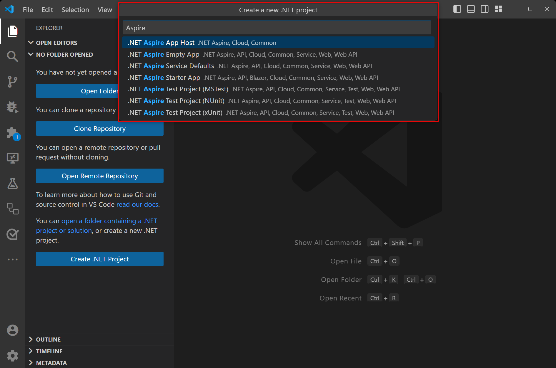 You can use Visual Studio Code, with the C# Dev Kit extension, to create and develop Aspire projects. To create a new Aspire project in Visual Studio Code, select the Create .NET Project button in the Explorer view, then select one of the Aspire templates: