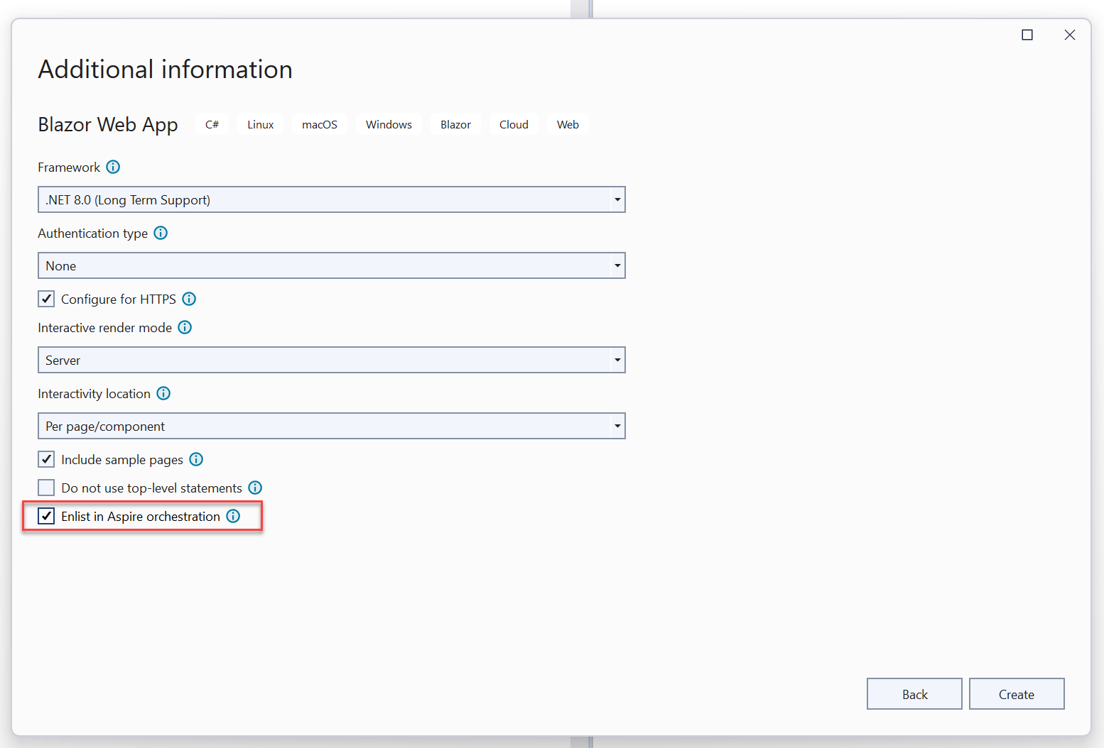 Visual Studio provides the option to Enlist in Aspire orchestration during the new project workflow. Select this option to have Visual Studio create *.AppHost and *.ServiceDefaults projects alongside your selected project template.