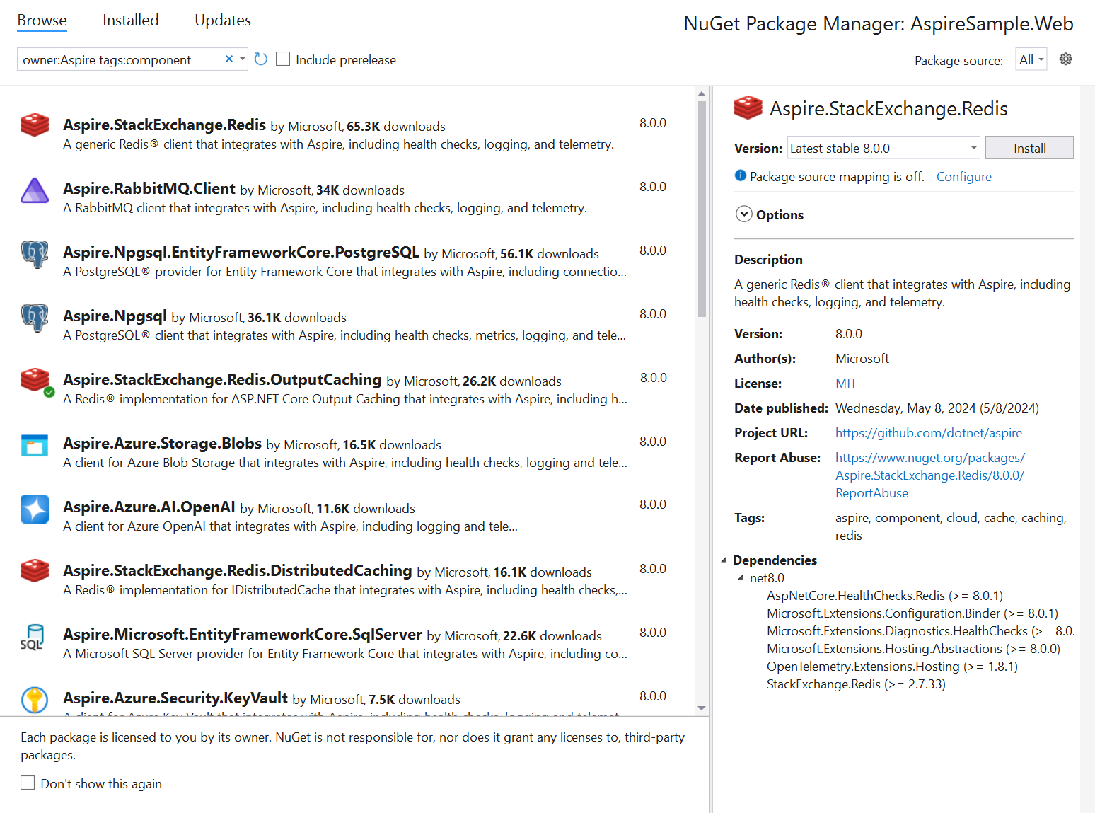 The package manager opens with search results preconfigured (populating filter criteria) for Aspire integrations, allowing you to easily browse and select the desired integration.