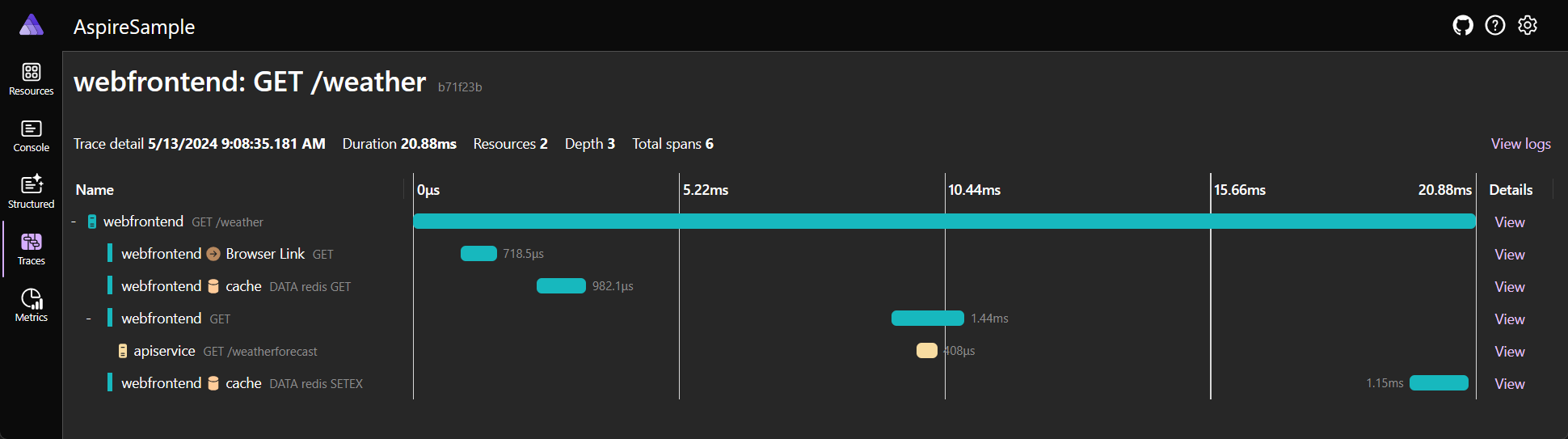 apiserviceand thewebfrontend. You can expand the details of each log entry by selecting the View button on the right end of the row.Traces: Displays the traces for your application, which can track request paths through your apps. Locate a request for /weather and select View on the right side of the page. The dashboard should display the request in stages as it travels through the different parts of your app.