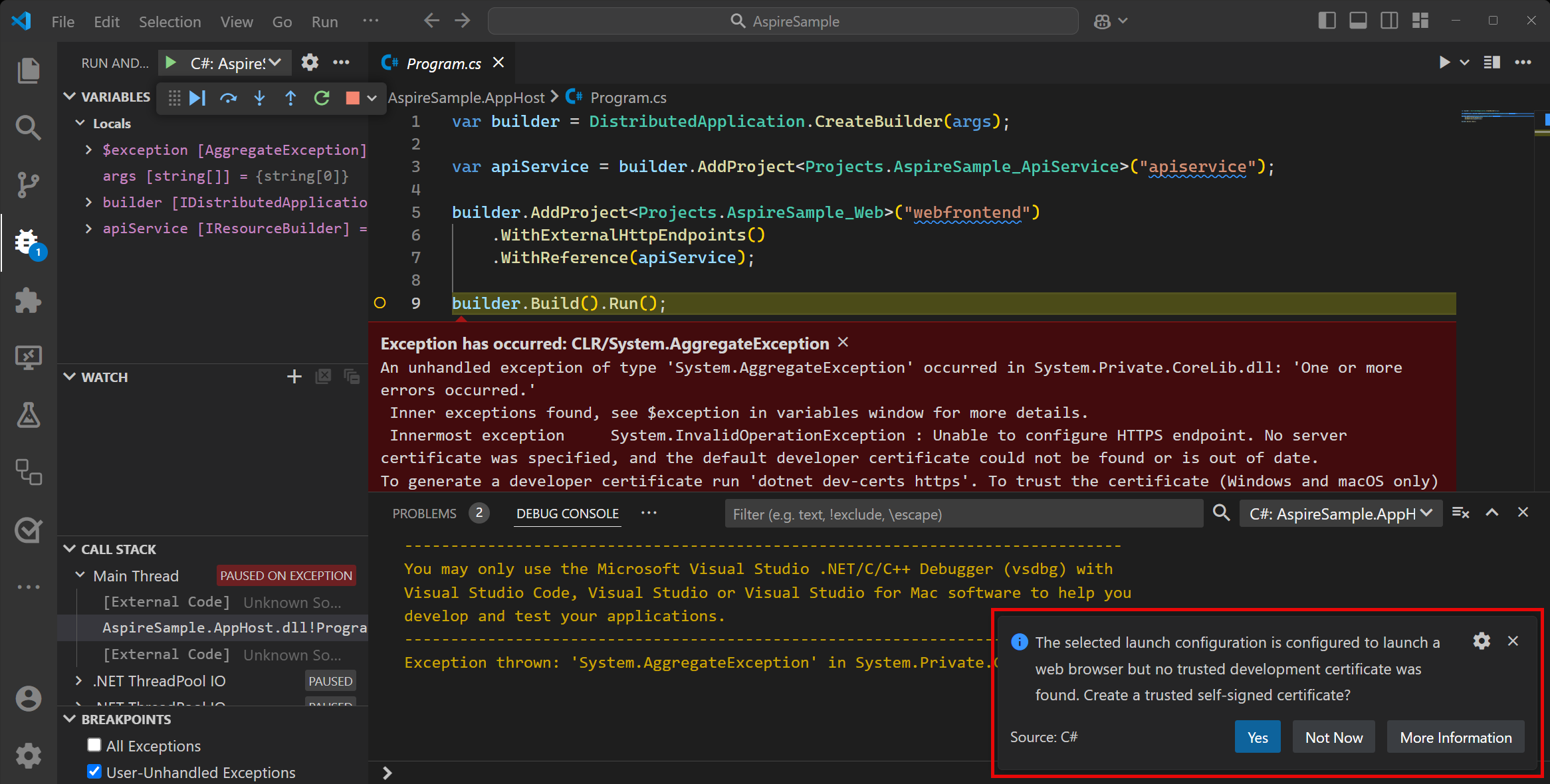 If this is the first time you're running Aspire, or it's a new machine with a new .NET installation, you're prompted to install a self-signed localhost certificateβand the project will fail to launch: