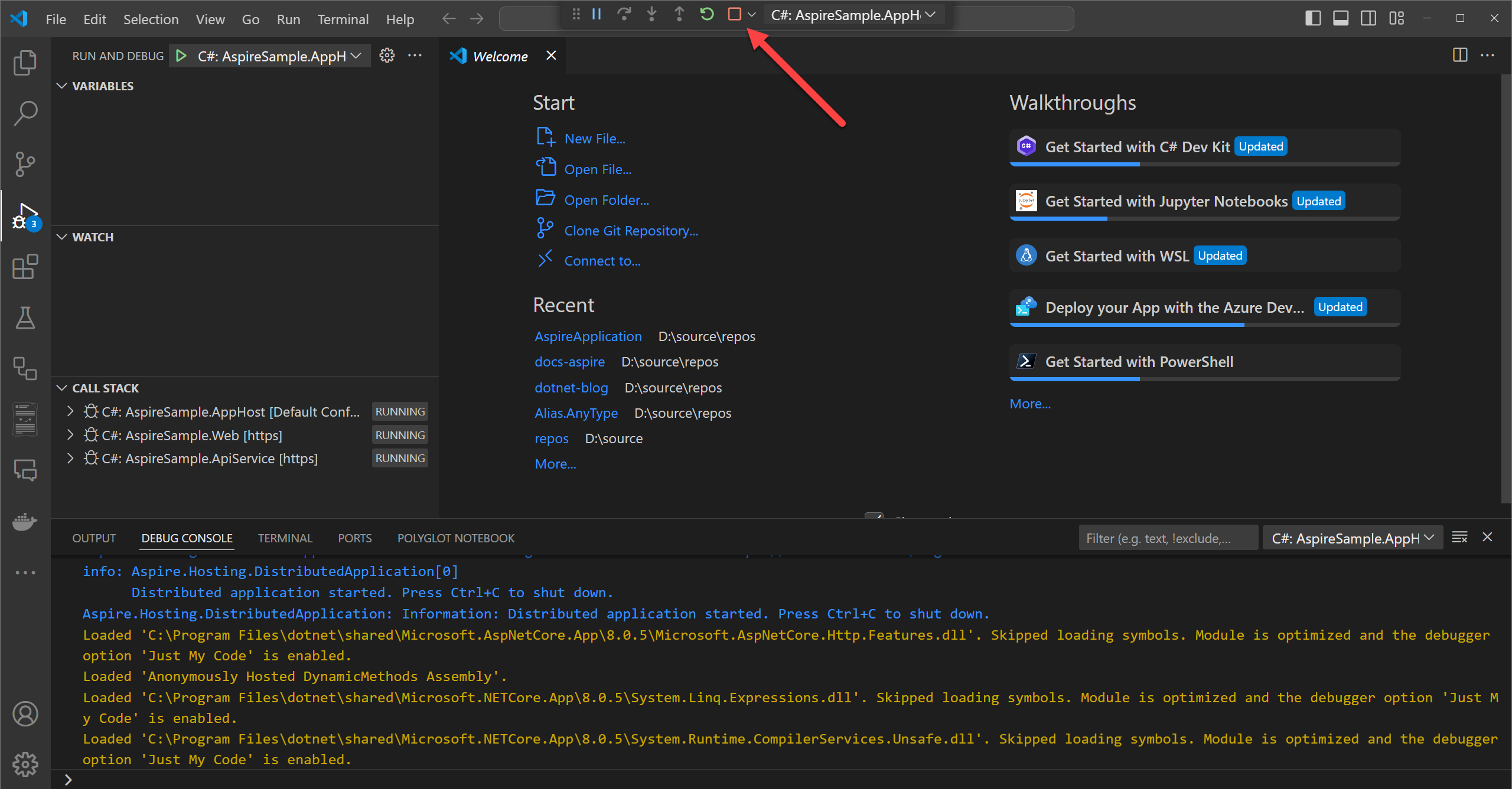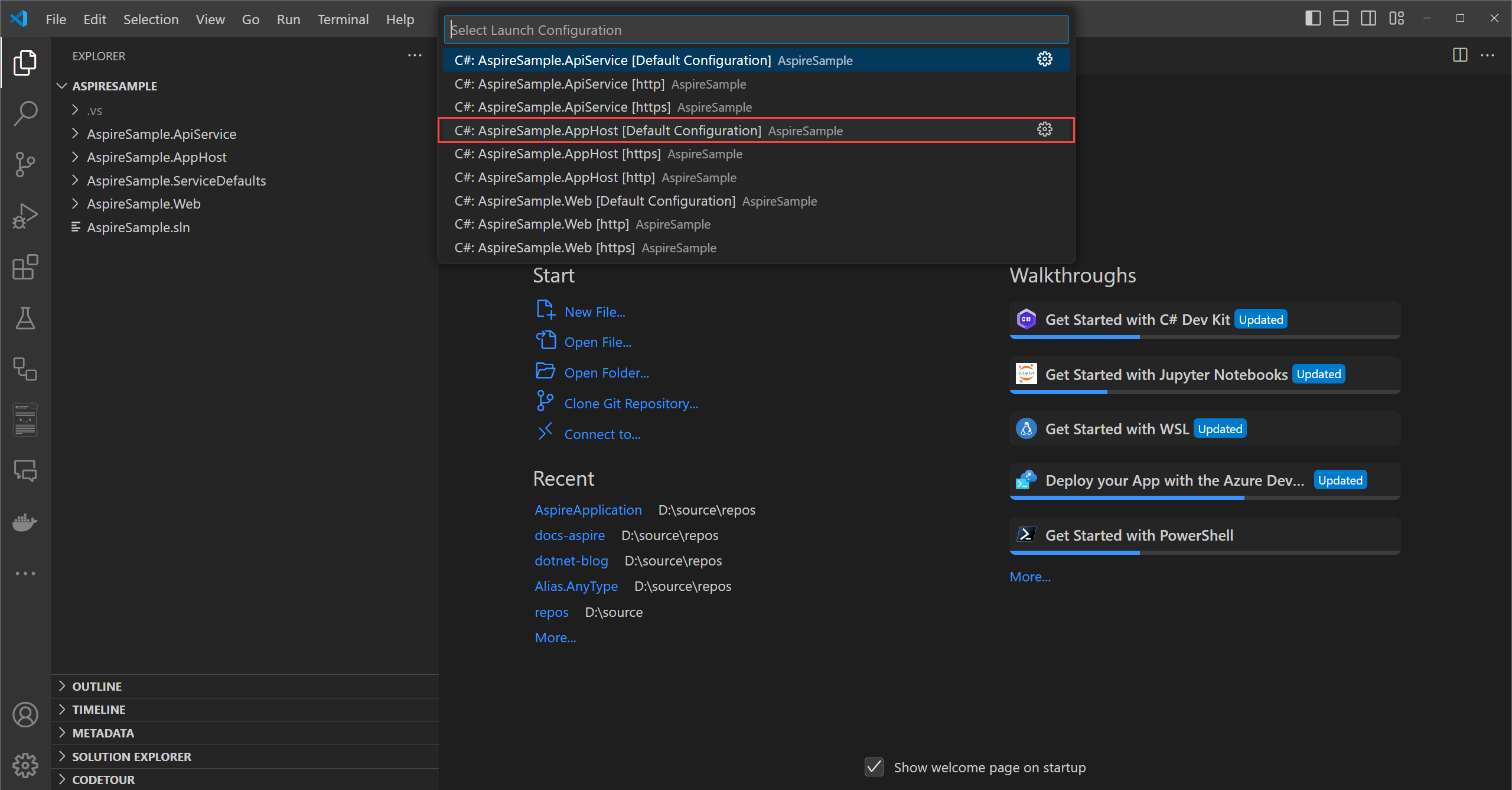 In Visual Studio Code, press F5 to launch the app. You're prompted to select which language, and C# is suggested. Select C# and then select the AspireSample.AppHost project with the Default Configuration: