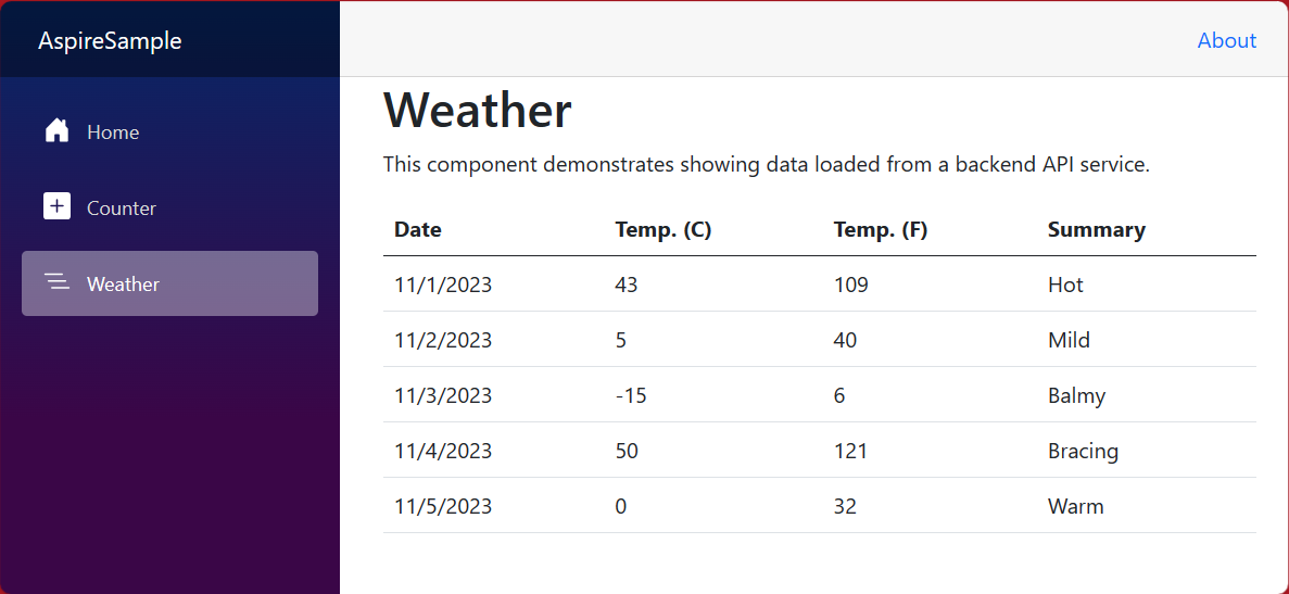 - AspireSample.Web: An ASP.NET Core Blazor App project with default Aspire service configurations, this project depends on the AspireSample.ServiceDefaults project. For more information, see Aspire service defaults.