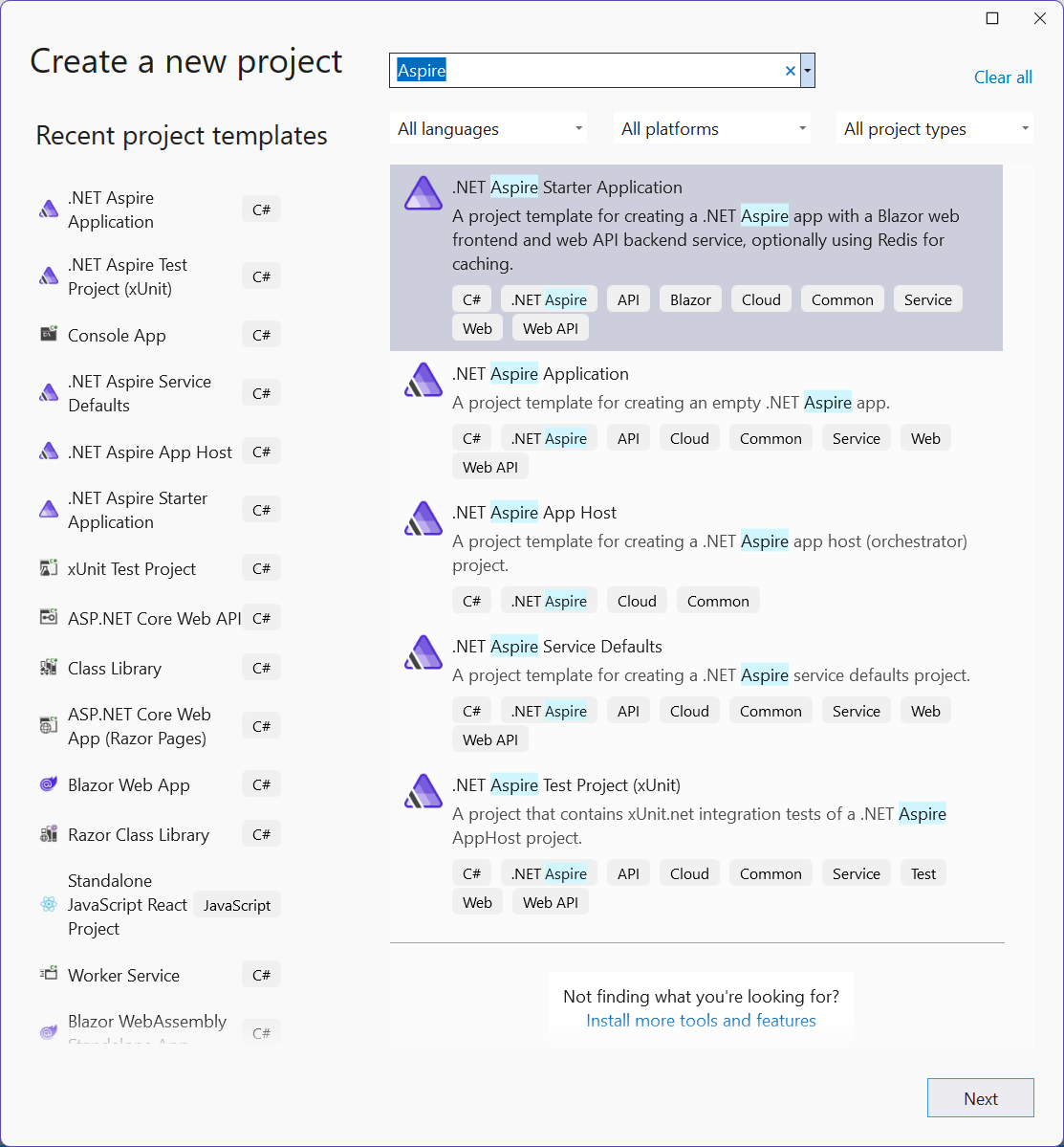 In the dialog window, search for Aspire and select Aspire Starter App. Select Next.