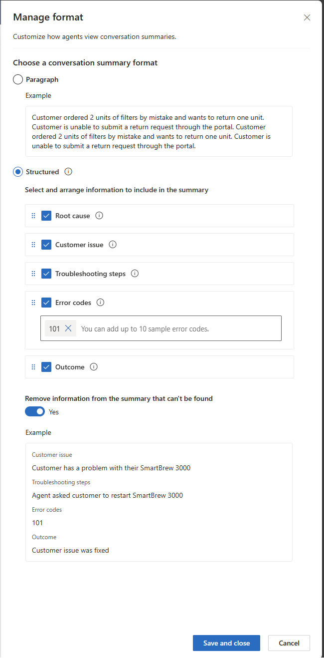 Select the Remove information from the summary that can't be found toggle to not display the information that can't be found in the conversation. For example, if the customer doesn't provide an error code, the error code isn't included in the summary.
