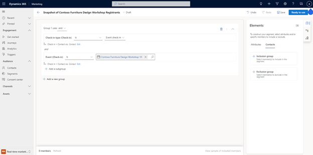 Improve marketing return on investment by targeting the right audience. Build segments directly in Dynamics 365 Customer Insights - Journeys with the powerful, easy-to-use logic builder that doesn't require specialized knowledge of complex data structures or logical operators. Preview the estimated segment size and membership before you mark your segment as "Ready to use" in customer journeys.