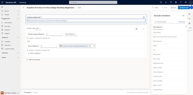 - You can also manually select members from Dataverse using the standard contact or leads grid view. To launch the standard Dataverse grid view, go to Manual select > Select members > Add members.