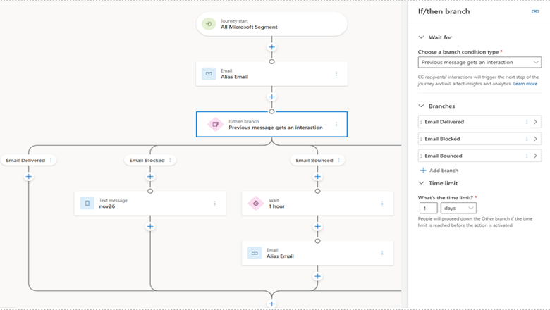 - Marketers can now create more personalized customer experiences by branching on multiple interactions within a single journey step. Using the "Wait for trigger" tile after a marketing message, journey designers can select "Previous message gets an interaction" and configure multiple triggers, like Email Opened, Email Blocked, or Email Bounced, on the same branch. This streamlines journey design by consolidating logic and enabling smarter engagement paths based on how recipients interact.