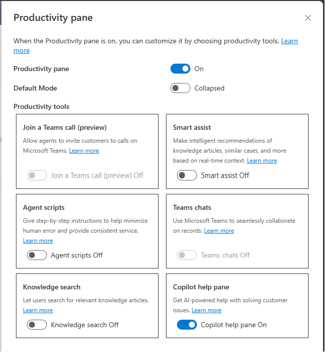 On the Productivity pane, turn on the Copilot toggle so that representatives can use the Copilot features such suggest a response, ask a question, and write an email on the productivity pane.